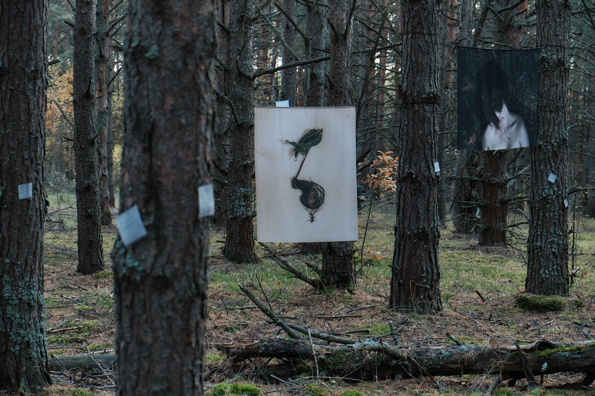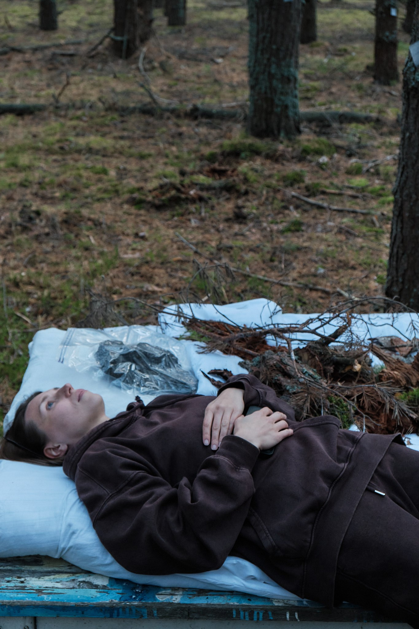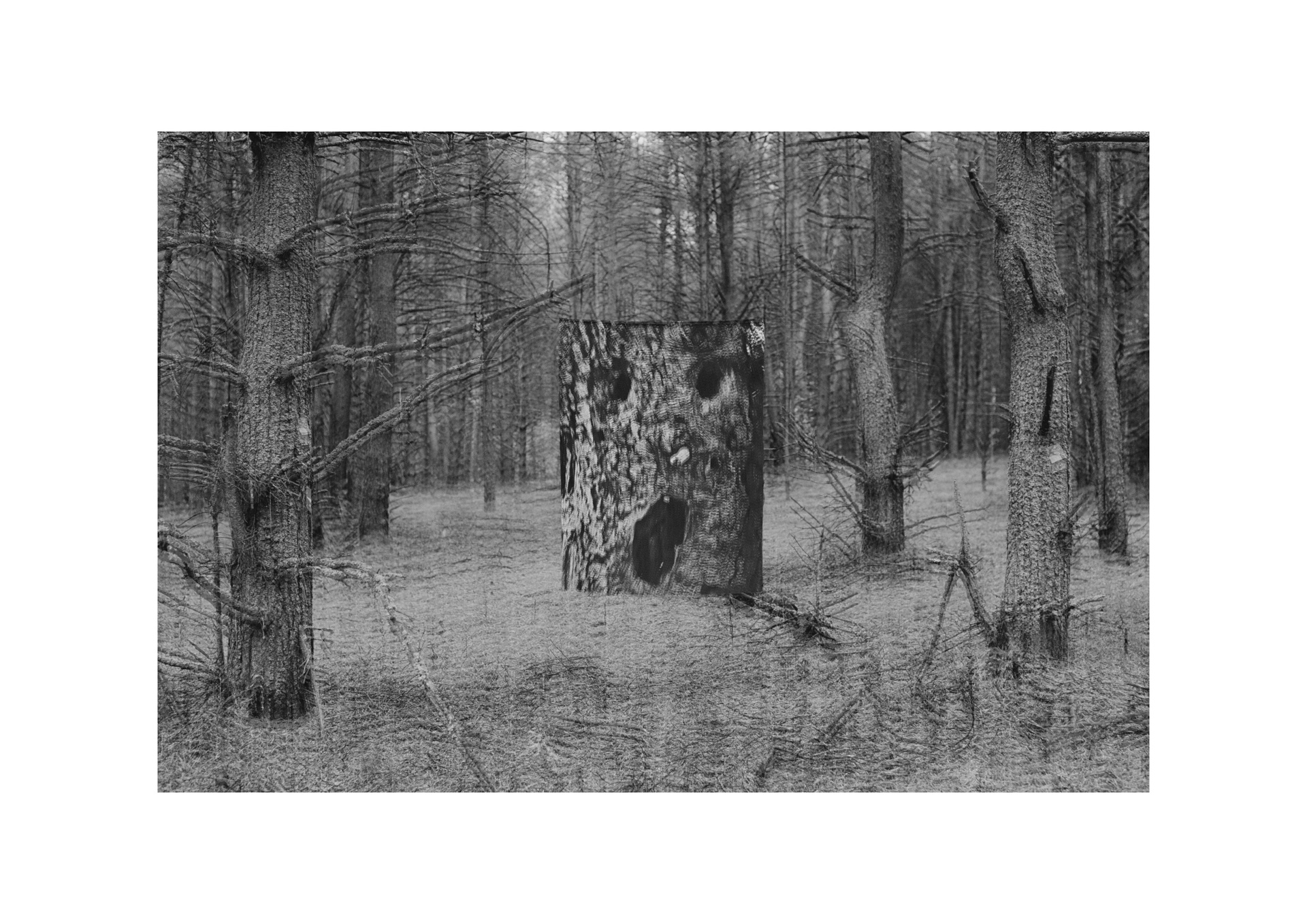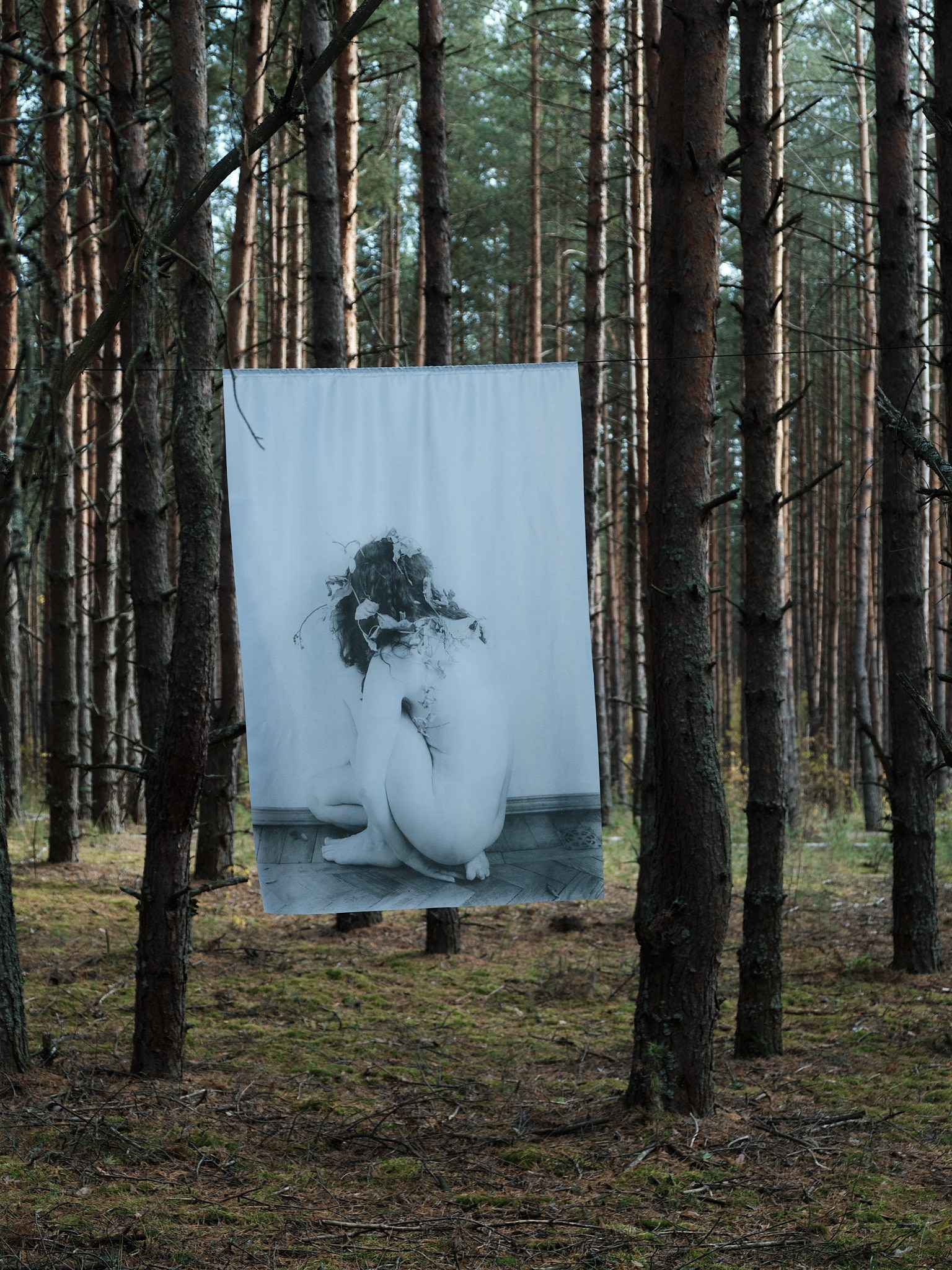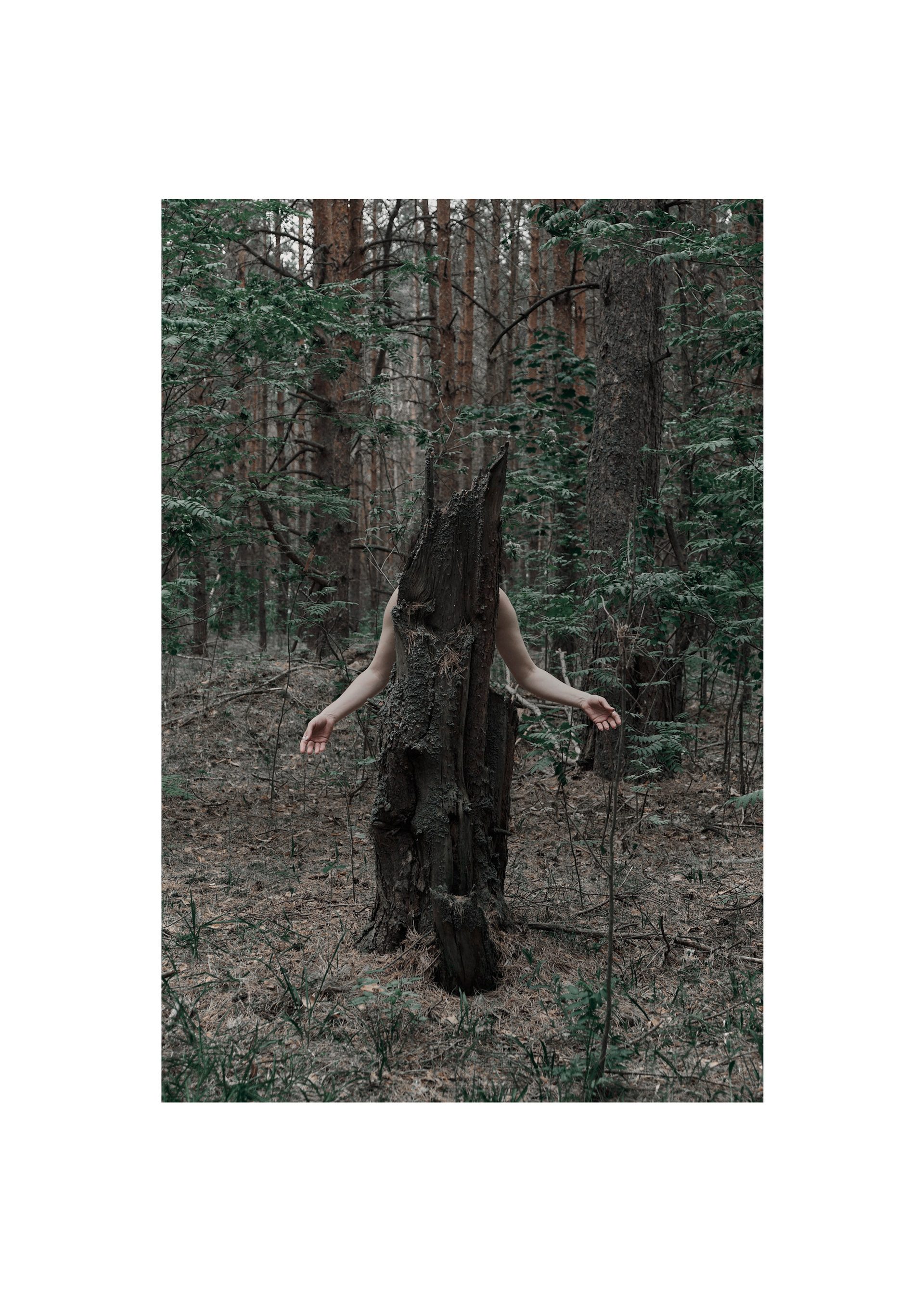 Мое путешествие между московской квартирой и лесом началось летом 2021 года, этим же летом мне поставили диагноз: депрессивно-тревожное расстройство. Важной опорой в этот период стал для меня контакт с природой. Блуждая по лесу, я находила отражение собственных процессов. Когда дерево умирает, его тело проходит естественный цикл распада, возвращаясь в экосистему. В древесину проникают грибы и насекомые, постепенно разрушая структуру волокон. Поваленные брёвна-кормилицы «nurse log» удерживают влагу и питательные вещества, создавая среду, в которой прорастают новые семена. Дерево распадается, чтобы стать почвой — основой для новой жизни. Во мне — то же самое: распад становится условием роста, разложение — питательной средой для рождения.