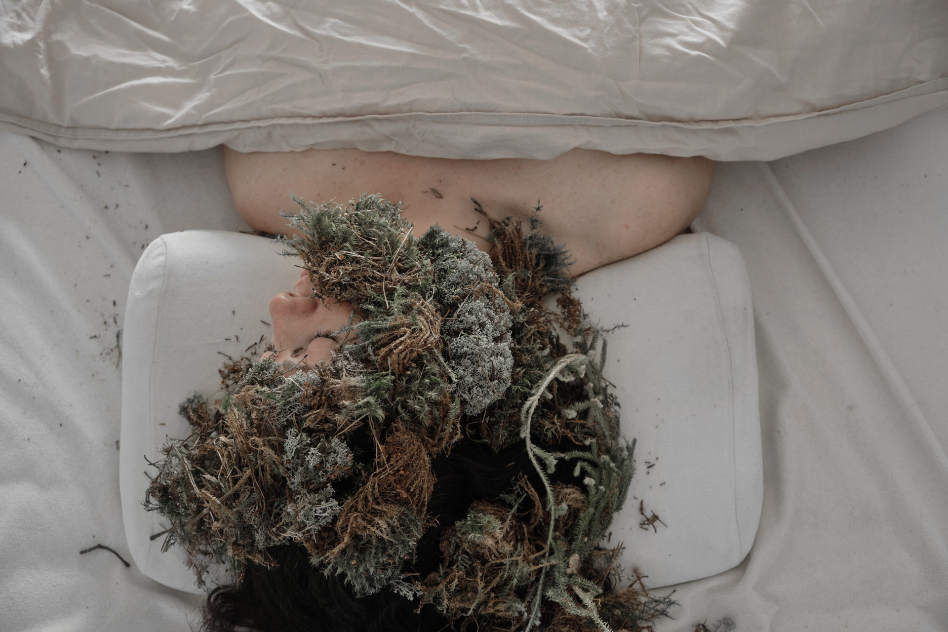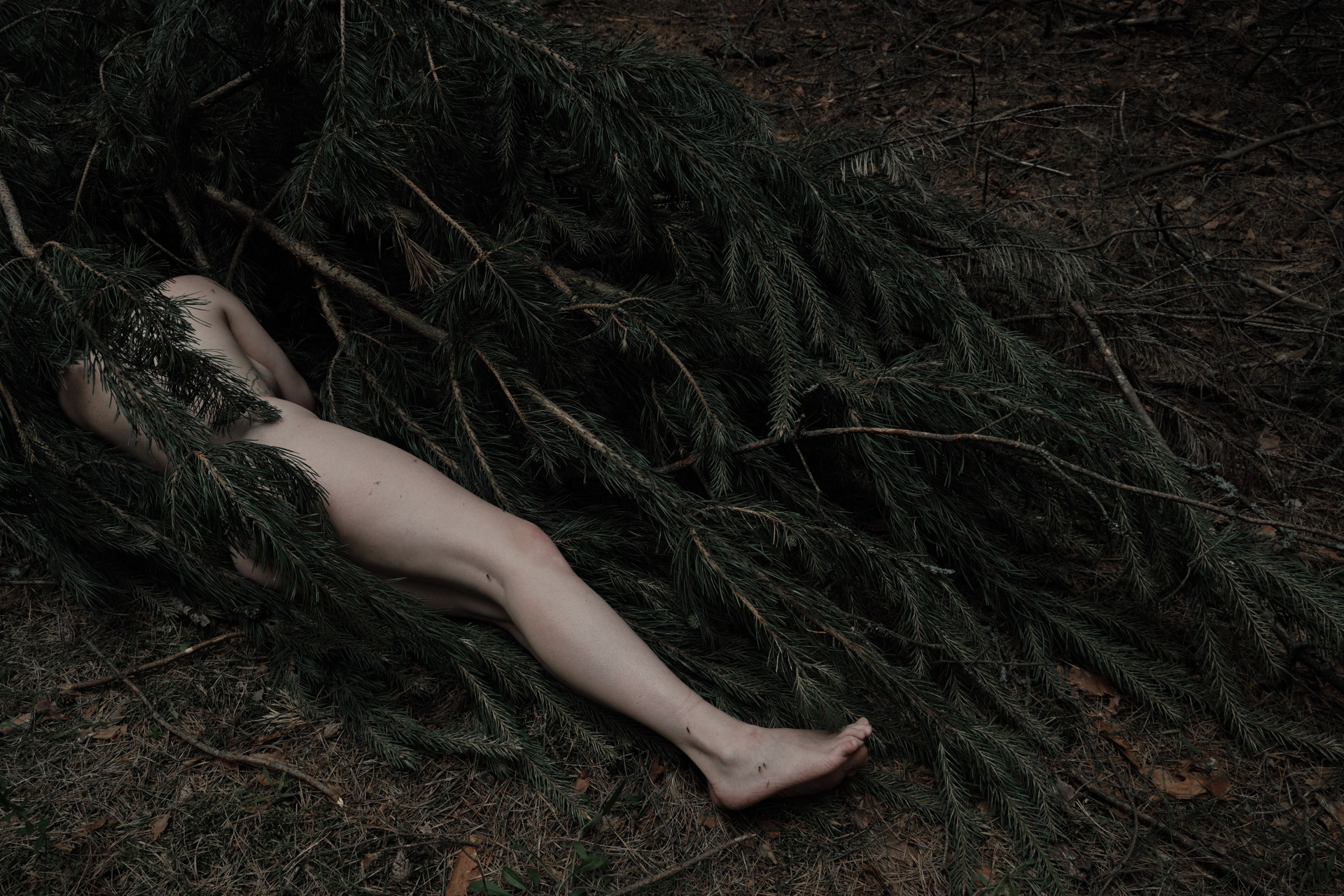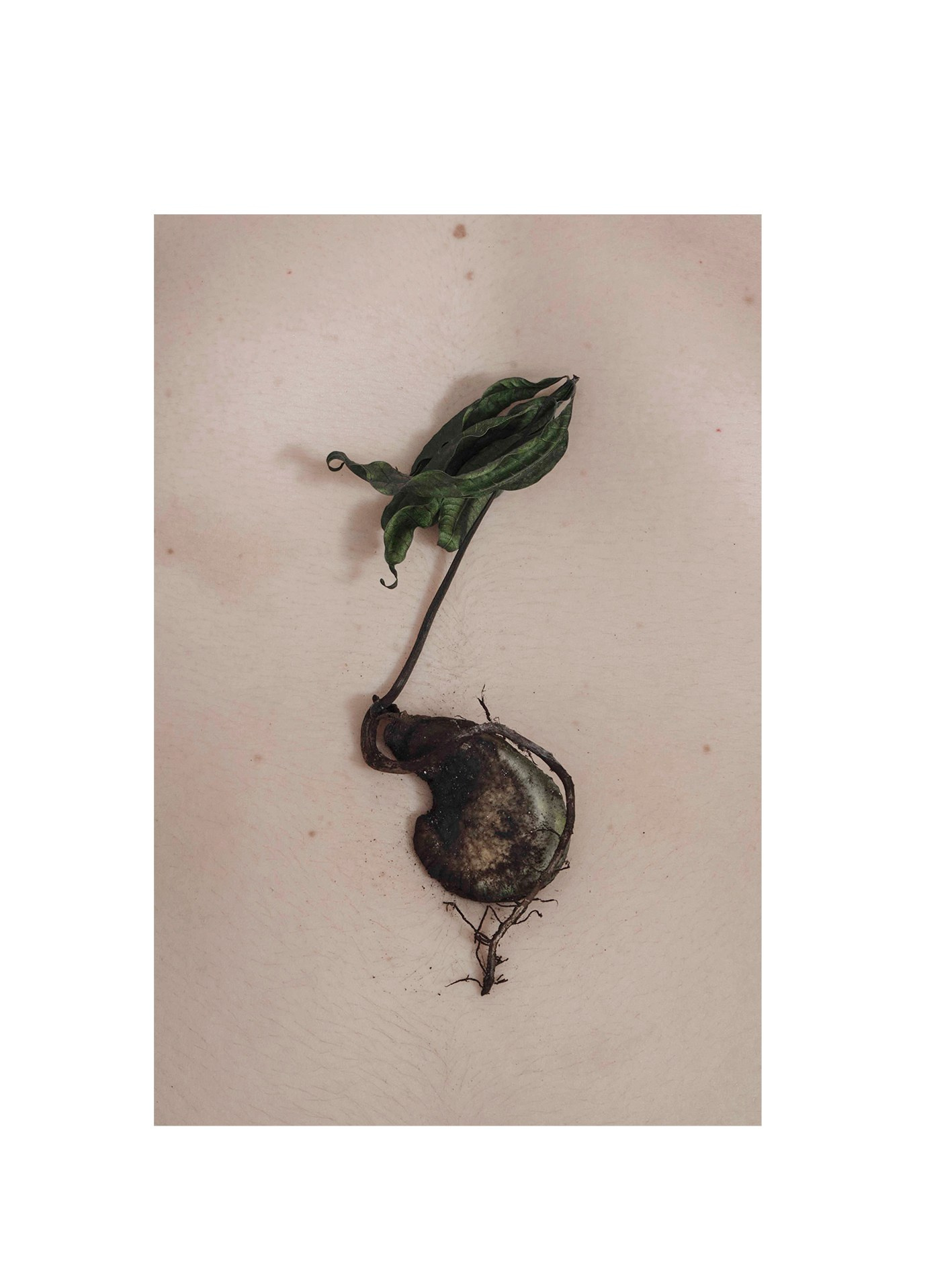 Мой проект — о переходе от мортидо к либидо, от смерти к жизни. Мортидо — это бессознательное влечение человека к разрушению или смерти, связанное с деструктивными импульсами, направленными на себя или других, и считается противоположностью либидо — влечению к жизни. В книге «Смерть, ритуал и вера» Дуглас Дэвис рассматривает феномен green burial — практику экологических захоронений, при которой тело хоронят без барьеров с землей, позволяя органике естественно разложиться и стать почвой. Мои автопортреты — это возвращение к жизни через телесность и прямой контакт с природой: кожа, земля, разложение, превращение. Этот процесс дает телу место в природной экосистеме, где всё живое включено в общий цикл распада и возрождения.»